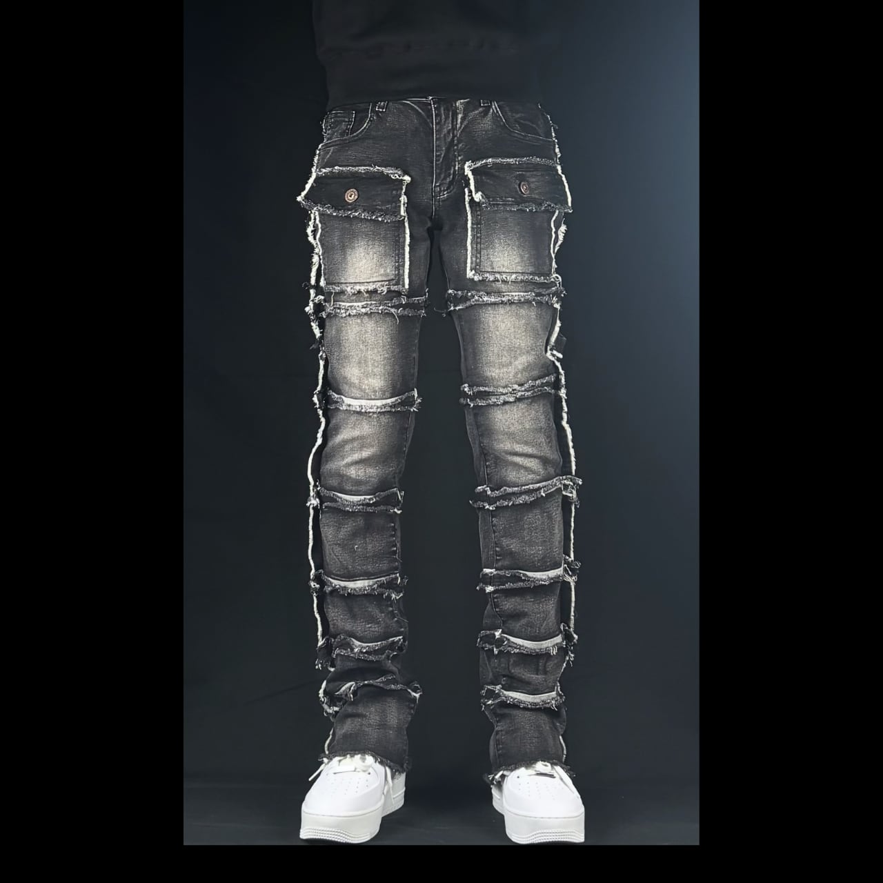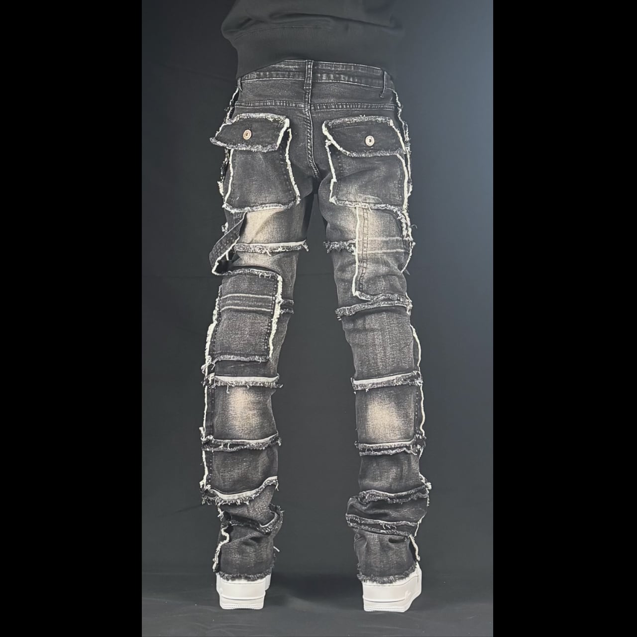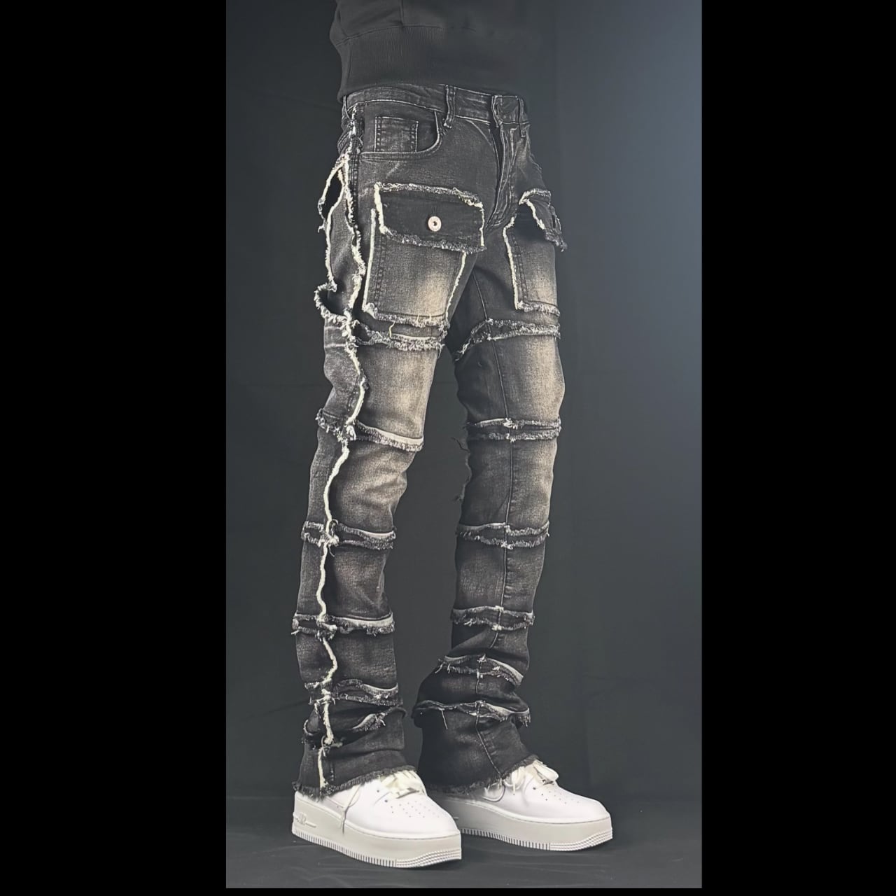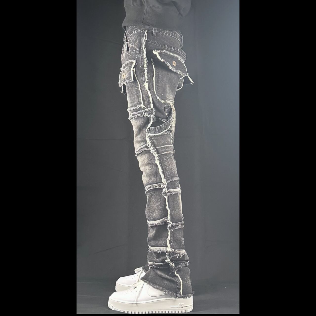 flare multi pocket stcked black denim【ES054】